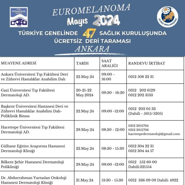 Hacettepe University Faculty of Medicine conducted free, public skin cancer screenings as part of the EUROMELANOMA International Awareness Campaign held between May 22–29, 2024. The event was organized in collaboration with Hacettepe University Faculty of Medicine, the Turkish Dermatology Association, and Euro Melanoma. The event was held to promote early diagnosis of melanoma and other skin cancers in the community and to raise health awareness.