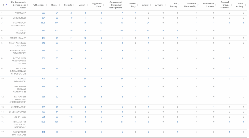Our university provides access to the projects, publications, collaborations, outputs and statistics of academic units and researchers related to the Sustainable Development Goals through the AVESIS research information system. In this way, the progress of our University within the scope of SDG is transparently presented to the public. You can click here to access the system.