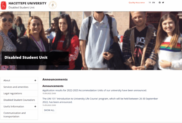 The university operates a dedicated Disabled Student Unit, which functions under an official directive. The unit provides academic, physical and social support to students with disabilities; coordinates accessibility and accommodation processes; facilitates access to learning materials, assistive devices and infrastructure; and organises awareness-raising activities on inclusive education. In each faculty, a Disability Student Counselors is appointed, and their contact information is publicly available on the unit’s website. In addition, a student representative with disabilities participates in the University Senate (without voting rights), ensuring representation in institutional decision-making processes.