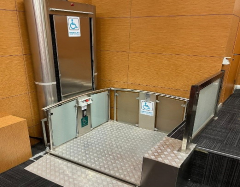 Accessible entrances, study spaces, elevators, and accessible restrooms in library buildings.